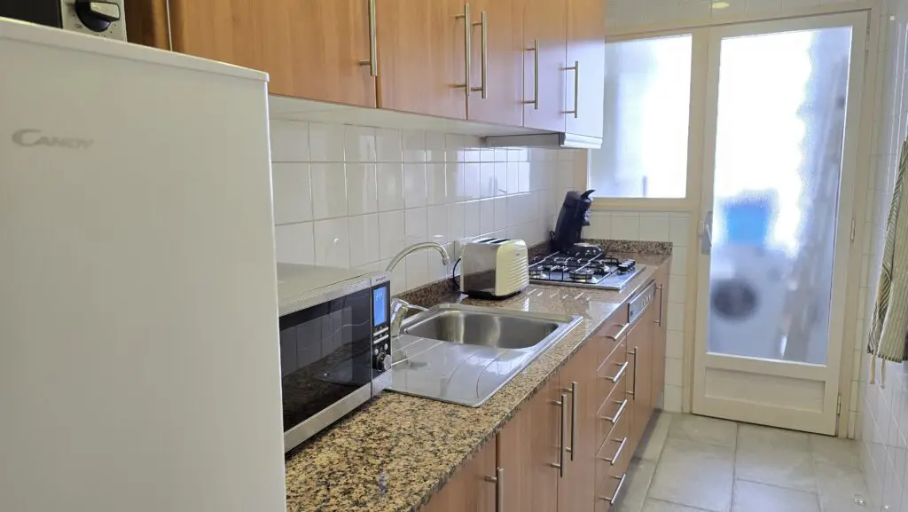 COCINA: independiente y totalmente equipada (nevera, vitrocerámica, microondas, cafetera, utensilios de cocina, etc.) con acceso a la zona de lavandería.