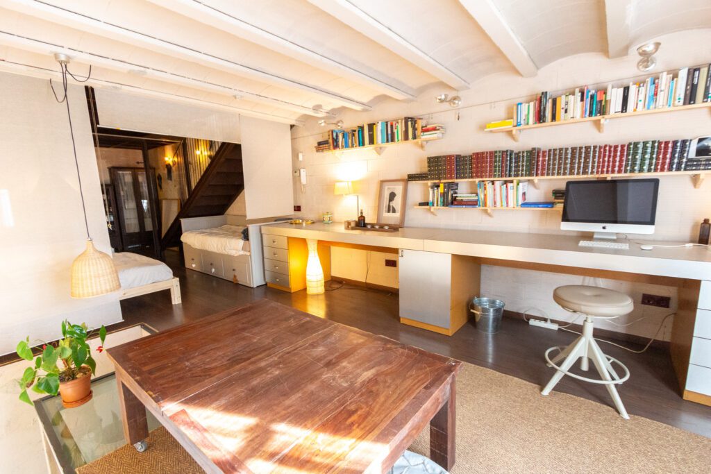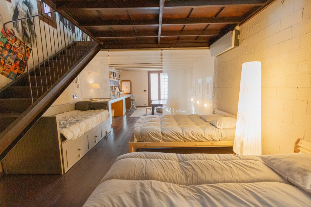 A la primera planta hi ha el segon dormitori amb 2 llits matrimonials, 1 llit individual i una lluminosa zona destudi.