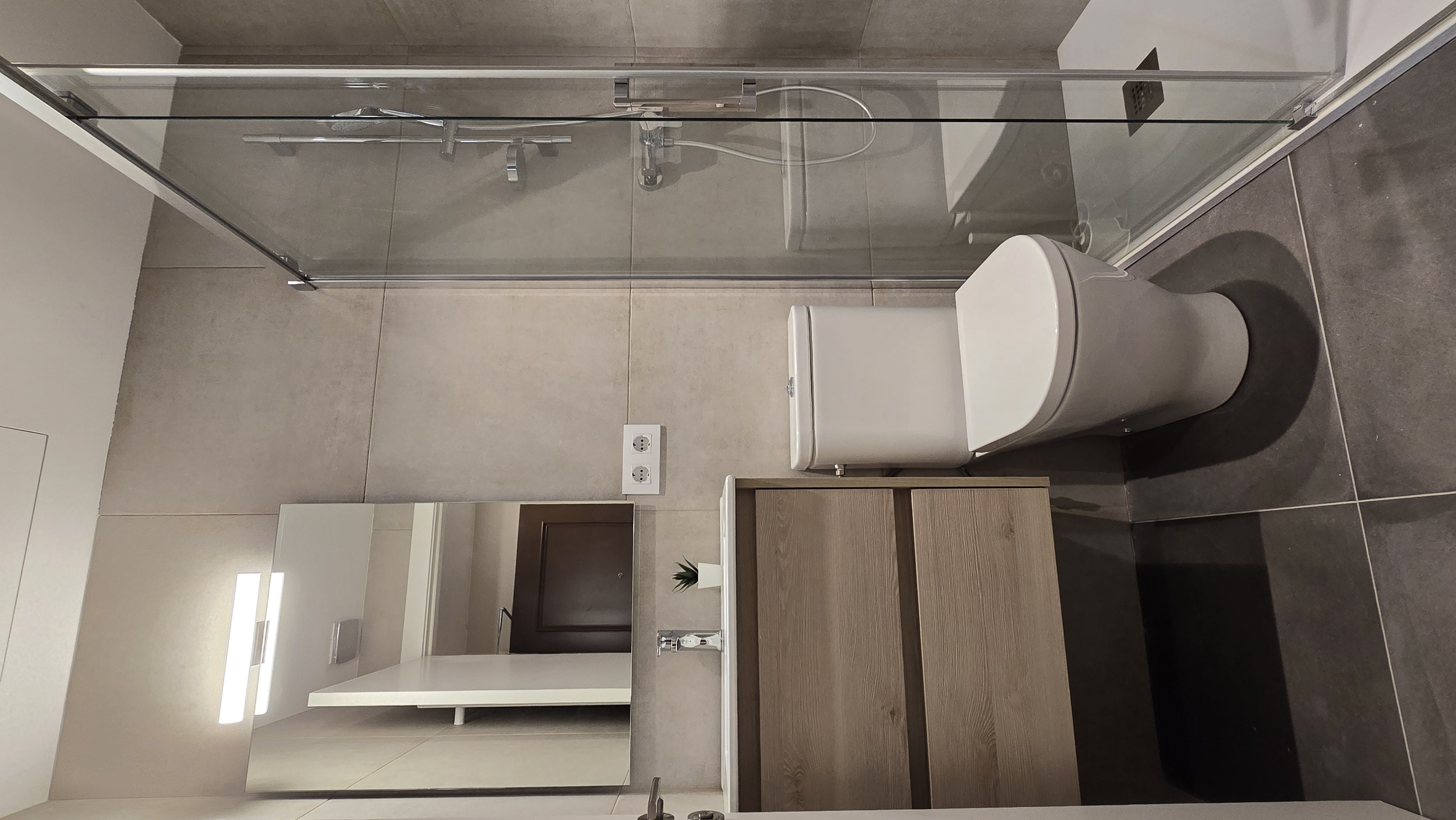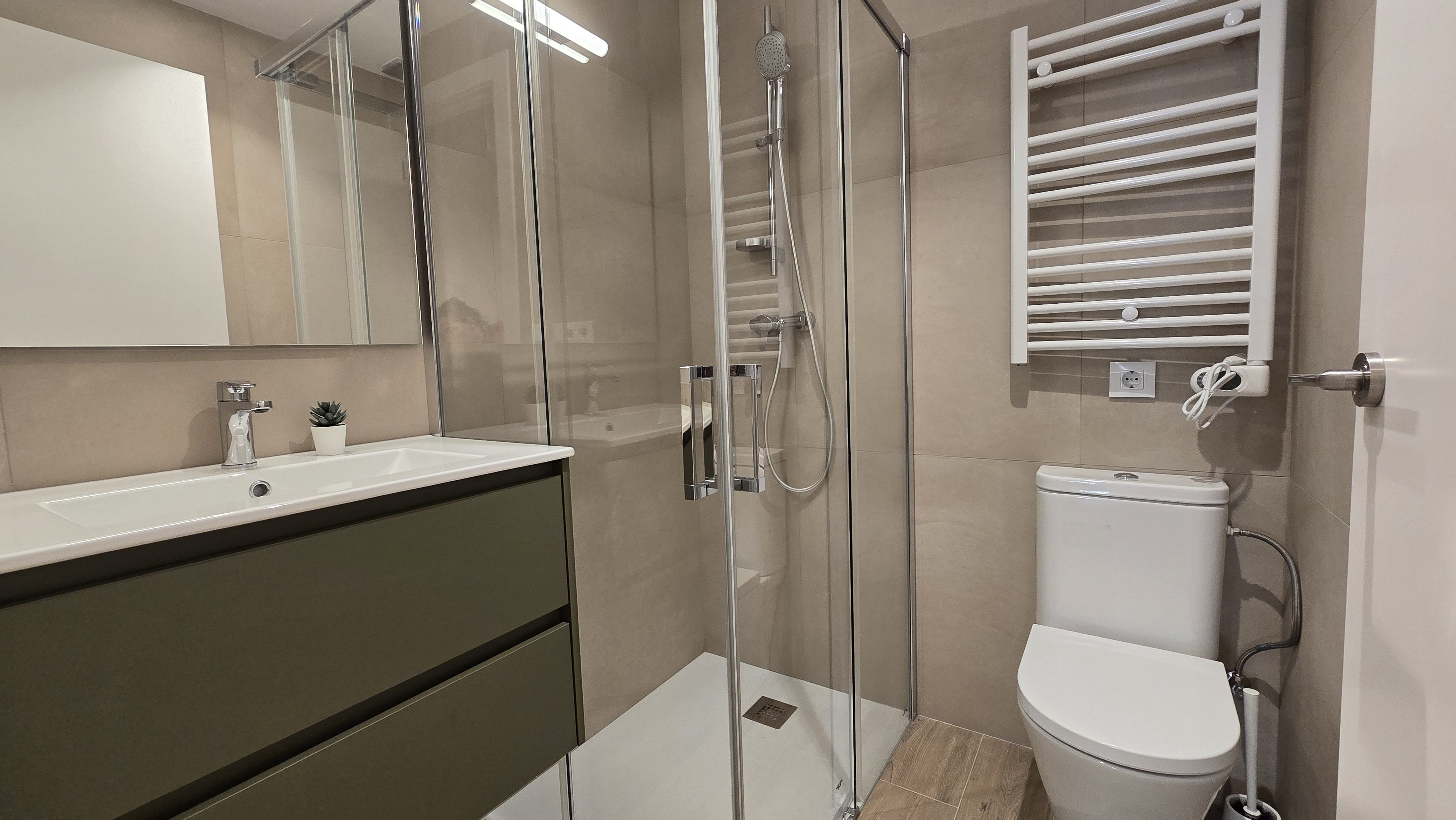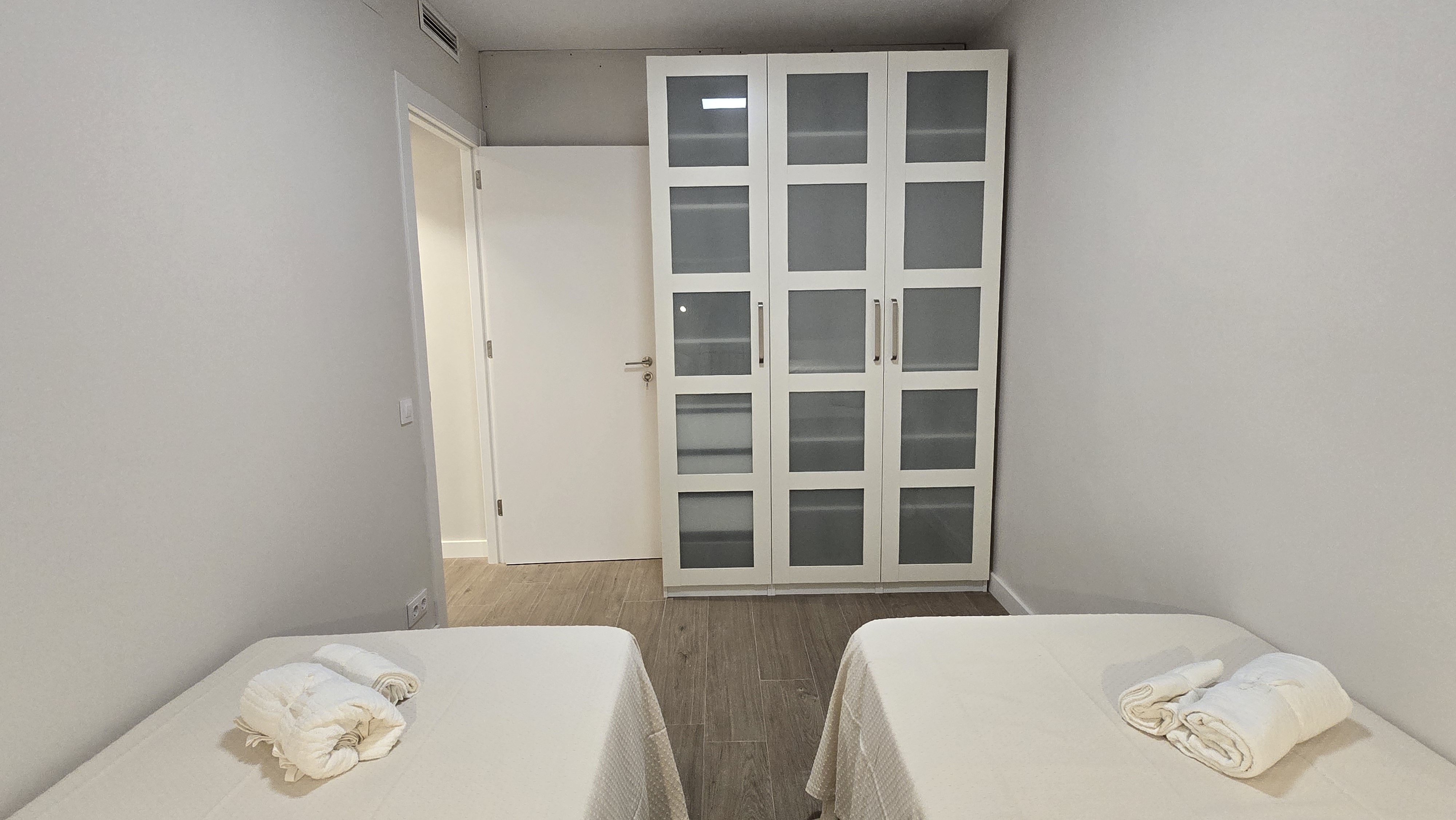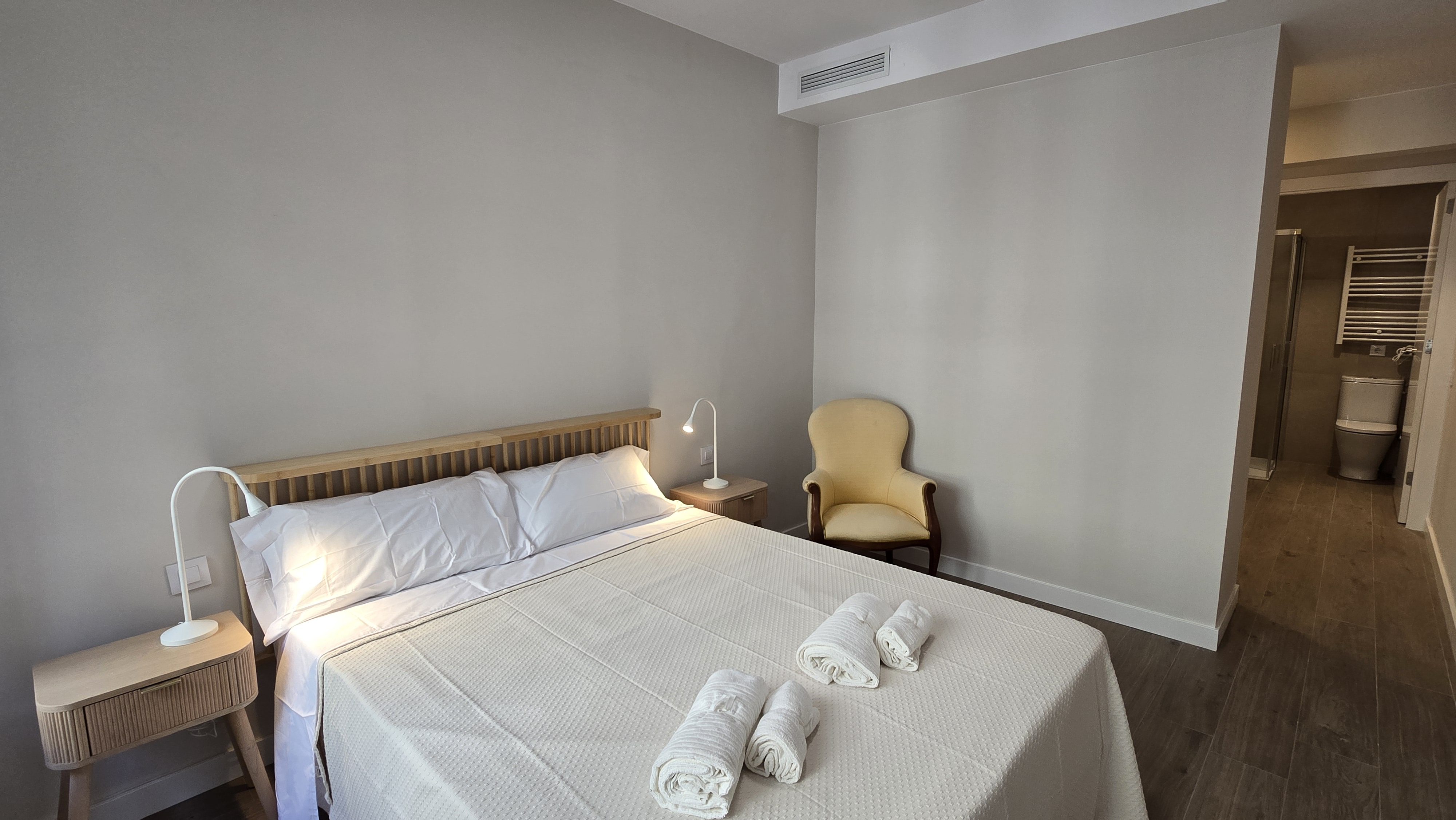 With three spacious bedrooms, a master bedroom with an en-suite bathroom and walk-in closet, a second double bedroom adaptable to your needs (either with two beds or a bed and study area), and a third single bedroom perfect for working or relaxing. The common areas flow into a bright living-dining room with exterior views, integrating an open kitchen with high-end appliances including a refrigerator, dishwasher, oven, microwave, toaster, and coffee maker, all accompanied by top-quality tableware and kitchen utensils.