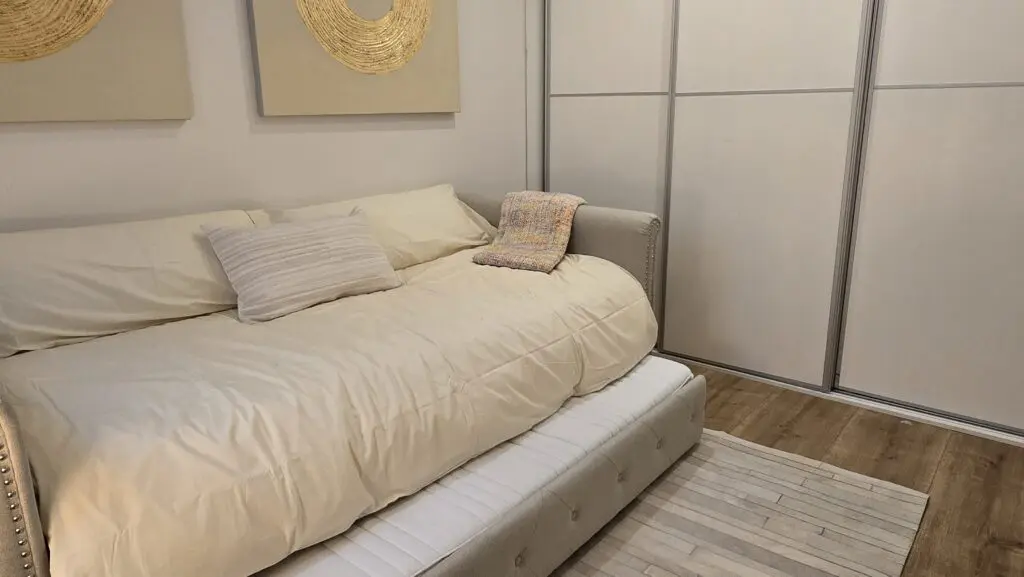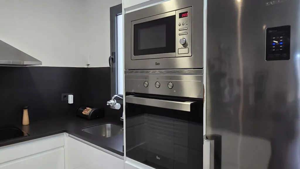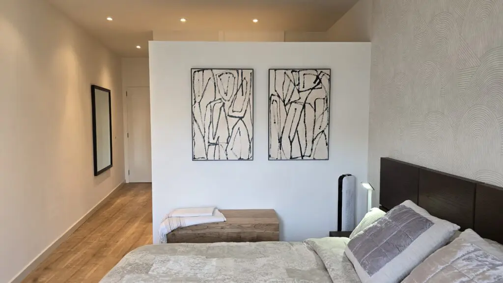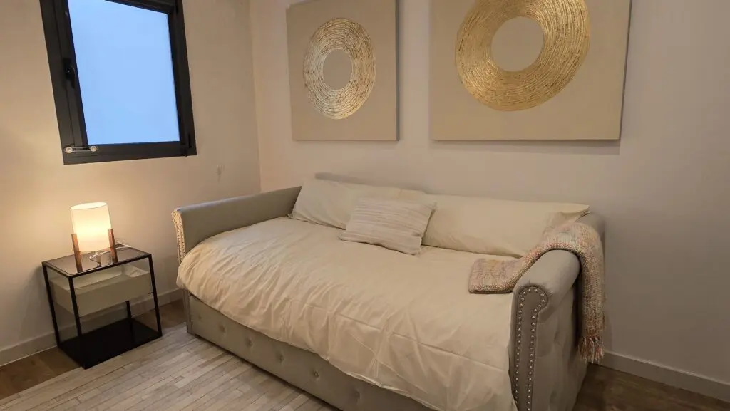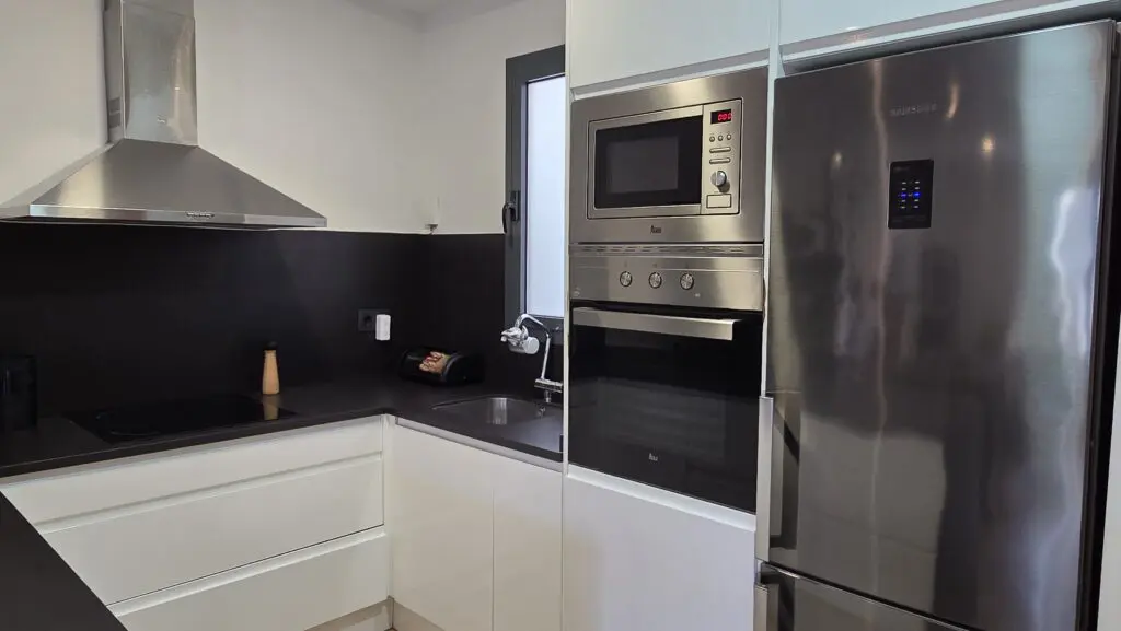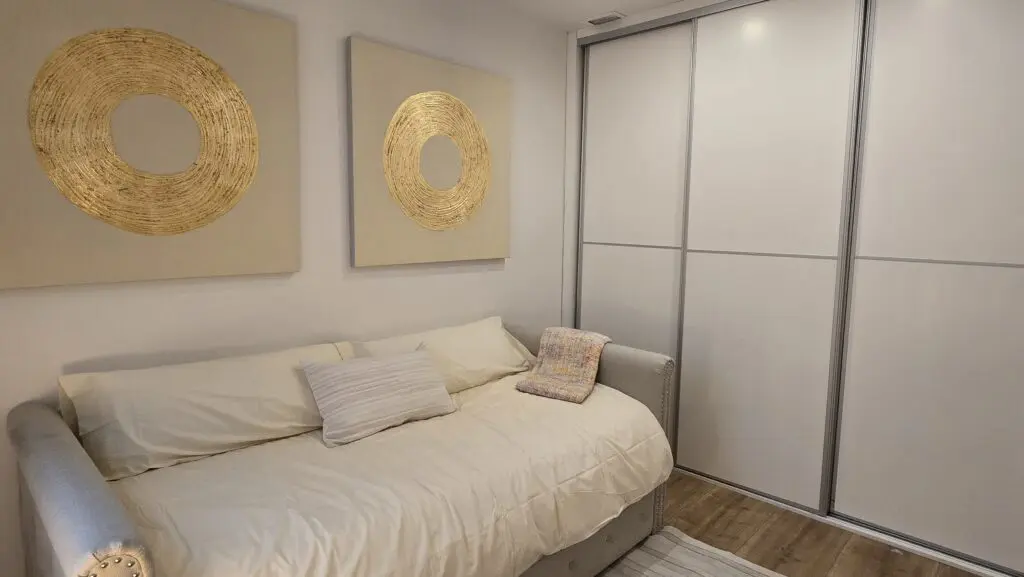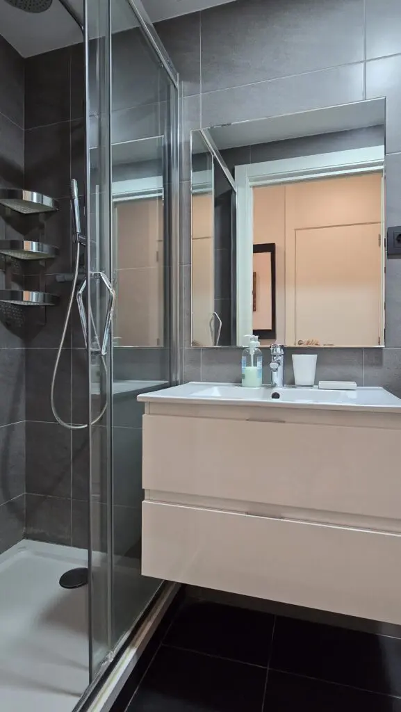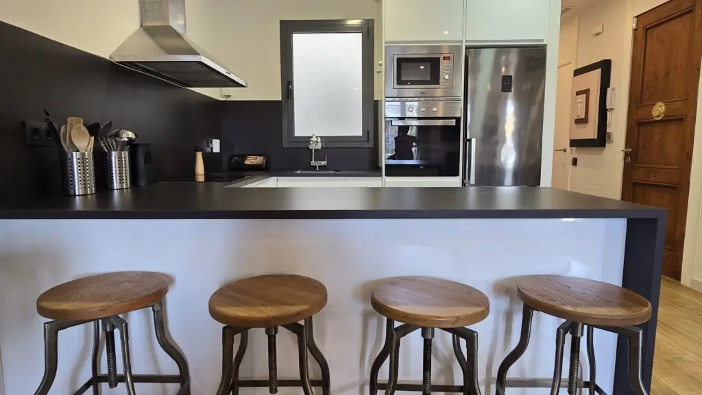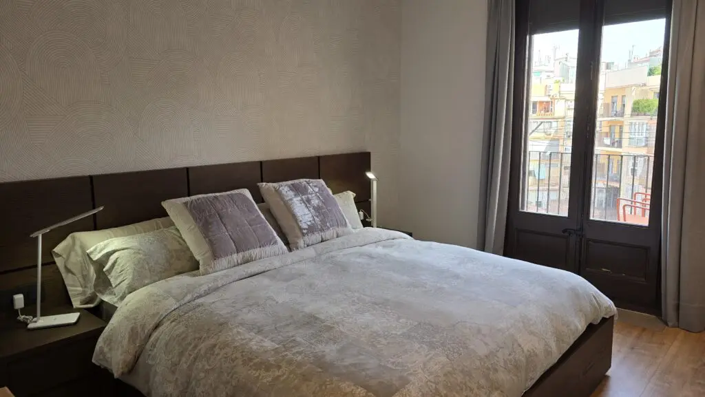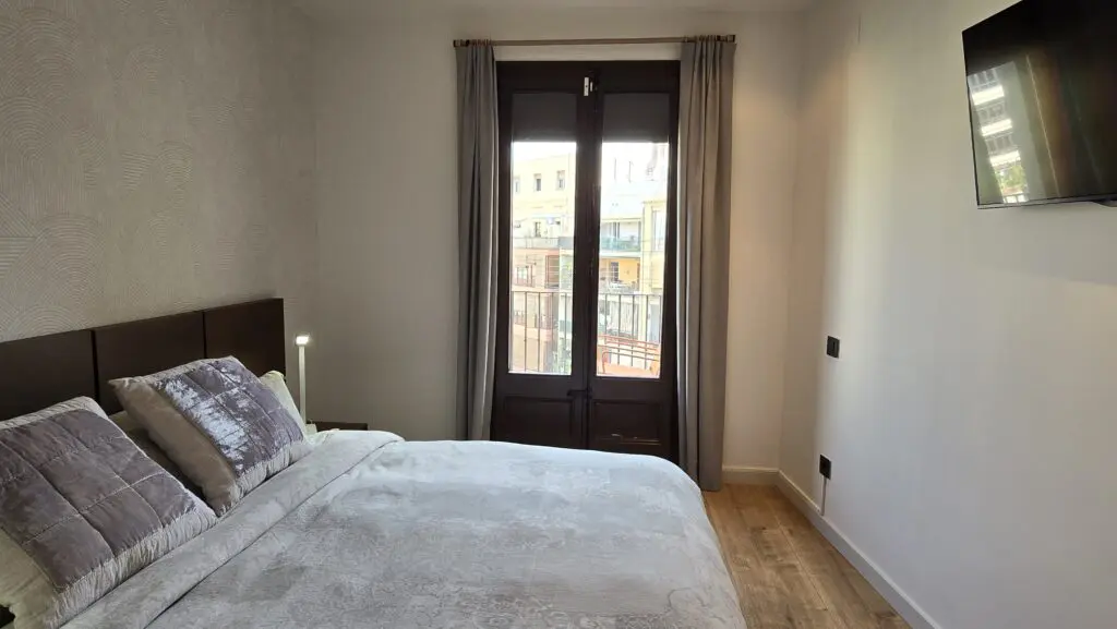 La chambre principale fait face au centre d'un bloc dégagé et dispose d'un lit de 1,80 m de large et d'une salle de bain complète avec douche. La deuxième chambre dispose d'armoires encastrées et d'un lit gigogne. Une deuxième salle de bain complète dessert le couloir. Le salon, décoré avec un design exquis, est extérieur face à la mer et donne sur la place Letamendi de la rue Aragón. Cuisine américaine entièrement équipée avec réfrigérateur, lave-vaisselle, plaque vitrocéramique, four, micro-ondes, cafetière, grille-pain et toutes sortes de vaisselle et ustensiles. Climatisation chaud/froid par conduits. Chambre avec laveuse et sécheuse. Interphone vidéo et alarme. Ascenseur.