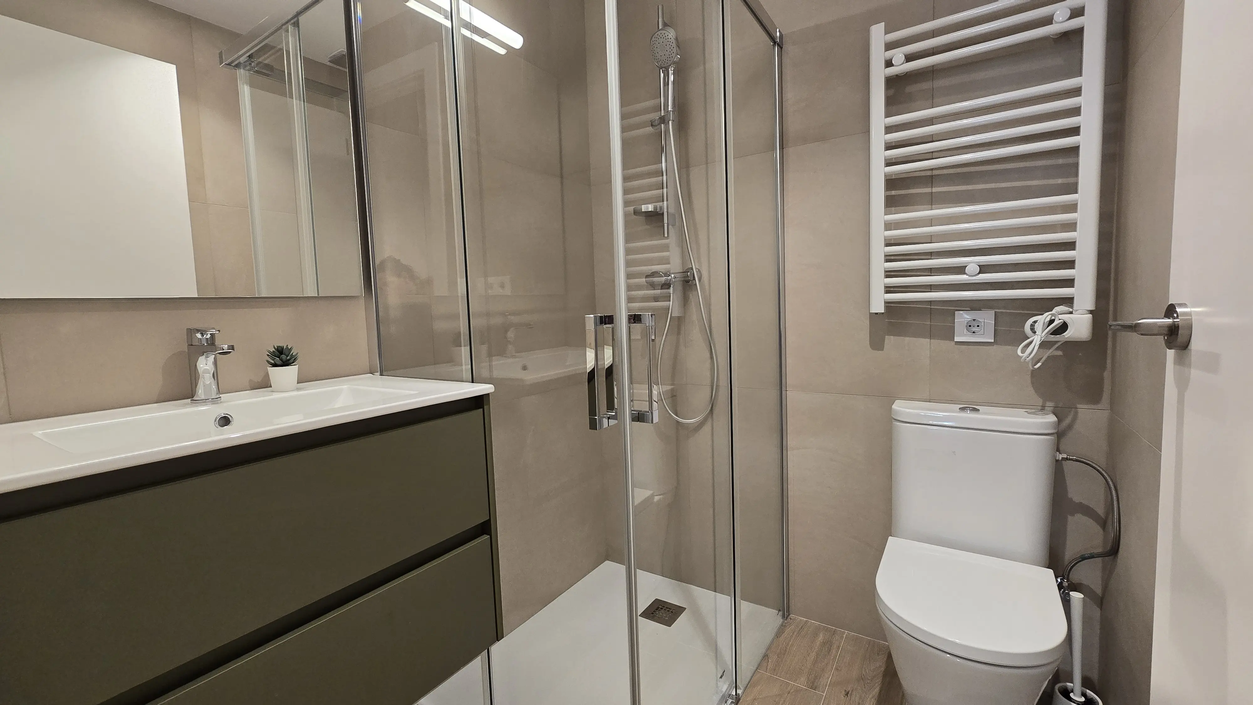 Les salles de bains modernes et bien conçues sont équipées de douches design. Chaque chambre est équipée de la climatisation intégrée, garantissant un confort optimal toute l'année. Un lave-linge et un sèche-linge sont également fournis, ainsi que des draps, des couvertures, des oreillers et une couette. L'appartement dispose également d'un grand balcon avec mobilier de jardin, idéal pour des moments de détente en plein air.